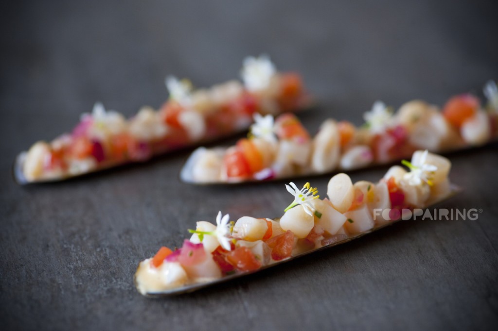 1 / Remplissez une casserole avec un peu d’eau et portez à ébullition. Faites une incision longitudinale dans les couteaux de mer. Mettez-les dix secondes dans de l’eau bouillante. Enlevez la chair de la coquille. Gardez les coquilles de côté pour le dressage. Coupez la chair en petits dés.