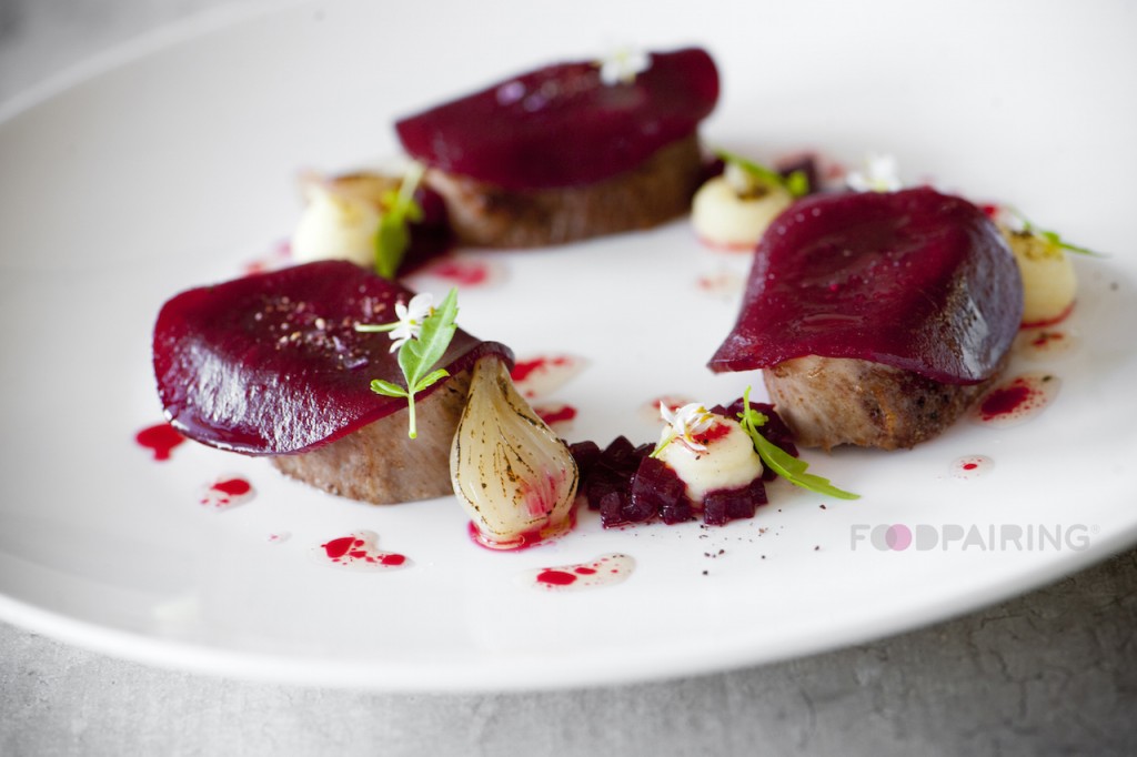 5 / Coupez le filet d’agneau en 6 morceaux et disposez-les sur deux assiettes. Mettez sur chaque morceau de viande une tranche de betterave. Déposez les betteraves en dés entre la viande. Mettez la purée de pommes de terre sur les assiettes et saupoudrez-la avec un peu de café fraîchement moulu. Mettez sur chaque assiette 3 demi petits oignons.